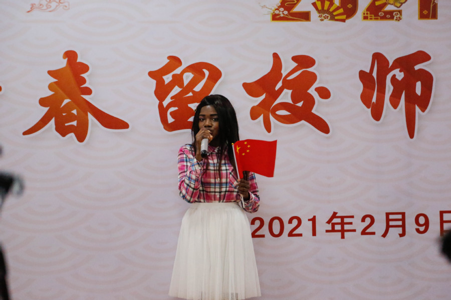 在联欢会上,各国留学生还表演了自己本国的歌舞,学校领导为每一位学生送去了“福”字和新年“红包”,留学生们则手举“福”字,用中文大声喊出“新春快乐,牛年大吉”的口号。