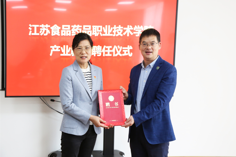 在江苏康缘药业股份有限公司会议室,冯锋代表学校为全国劳动模范凌娅副董事长颁发产业教授聘任证书,并对产业教授的加盟表示欢迎和感谢,希望通过产业教授的桥梁和纽带作用,促进教育链、人才链、创新链以及产业链的有机衔接;实现符合学校、市场行业需求的专业应用性人才的高效培养。
