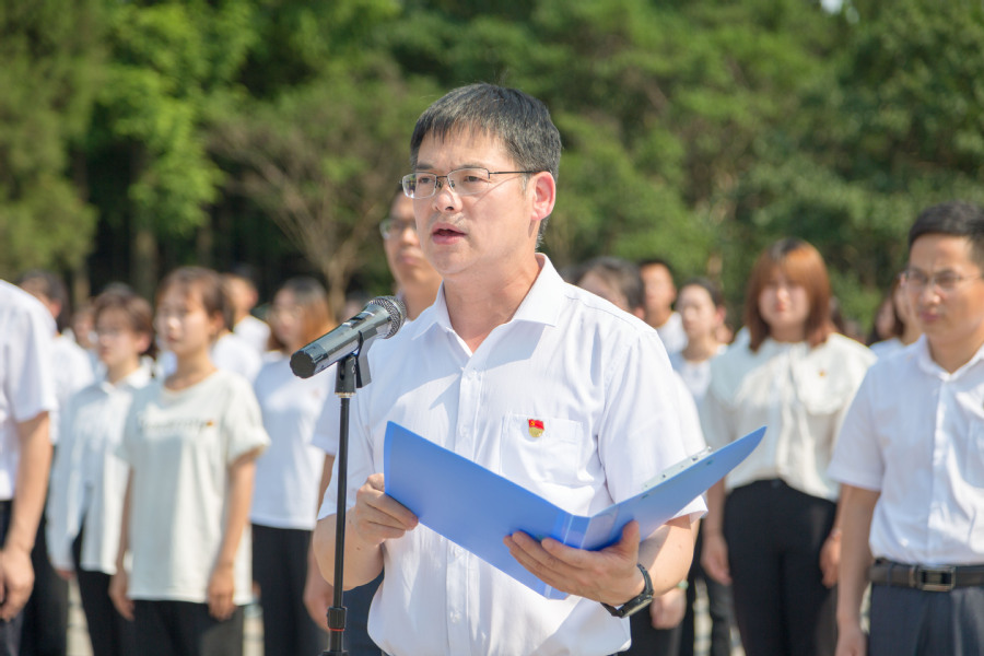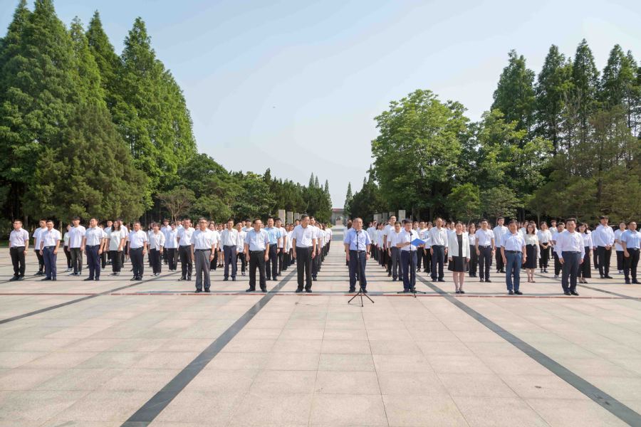 在庆祝中国共产党成立100周年之际,为激励新党员牢记初心使命,一心一意当好中国特色社会主义事业建设的薪火传人;激励老党员牢记初心使命,始终站在攻坚克难最前沿,6月22日下午,学校党委组织168名新党员及班子成员、全体党总支书记赴刘老庄八十二烈士陵园进行集中入党宣誓,接受党性实境教育。党委书记陶书中领誓并发表讲话。党委副书记、校长冯锋主持宣誓仪式。