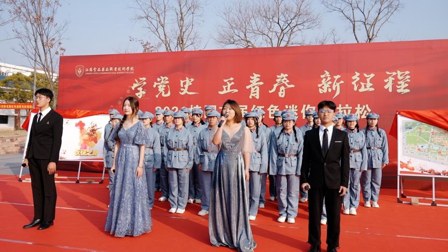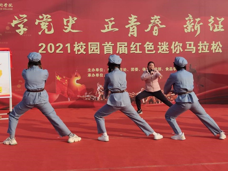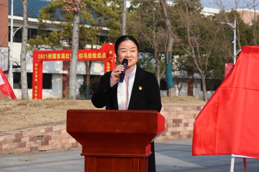副校长翟玮玮发表致辞,希望大家用红色擦亮人生的底色,把这抹红融入血脉之中,在奔跑中回望革命先烈的长征路,在奔跑中感悟和体会革命先烈艰苦卓绝的奋斗精神,在奔跑中传承红色基因,弘扬伟大长征精神,用奔跑和速度展示食品人的活力与激情,以昂扬之姿投入到学习、工作和生活当中。