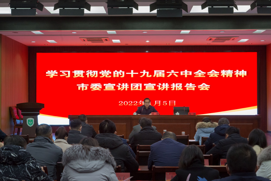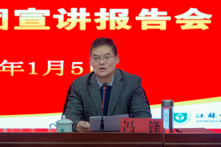 为进一步深化党史学习教育,学深学透党的十九届六中全会精神,2022年1月5日下午,学校邀请淮安市委宣讲团成员董峰同志来校进行专题学习辅导。报告会由党委副书记、校长冯锋主持,全体中层干部参加学习。