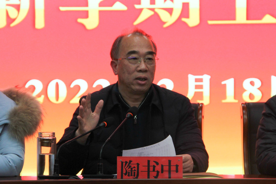 ▲党委书记陶书中主持会议并发表讲话
