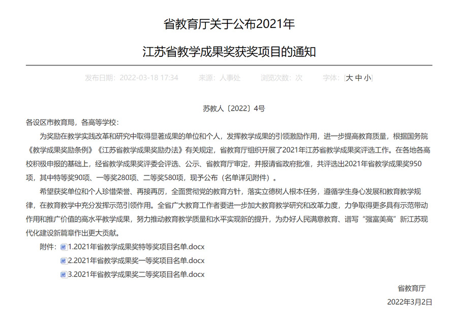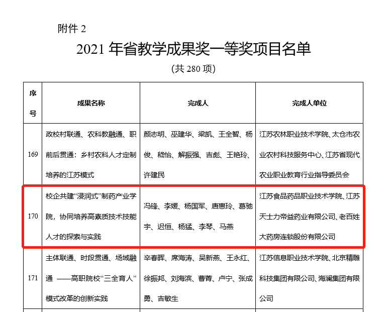 近日,江苏省教育厅发布了《关于公布2021年江苏省教学成果奖获奖项目的通知》,胜游娱乐“校企共建‘浸润式’制药产业学院,协同培养高素质技术技能人才的探索与实践”成果获得一等奖,并受邀在江苏省高等教育学会学术年会上进行成果推广。