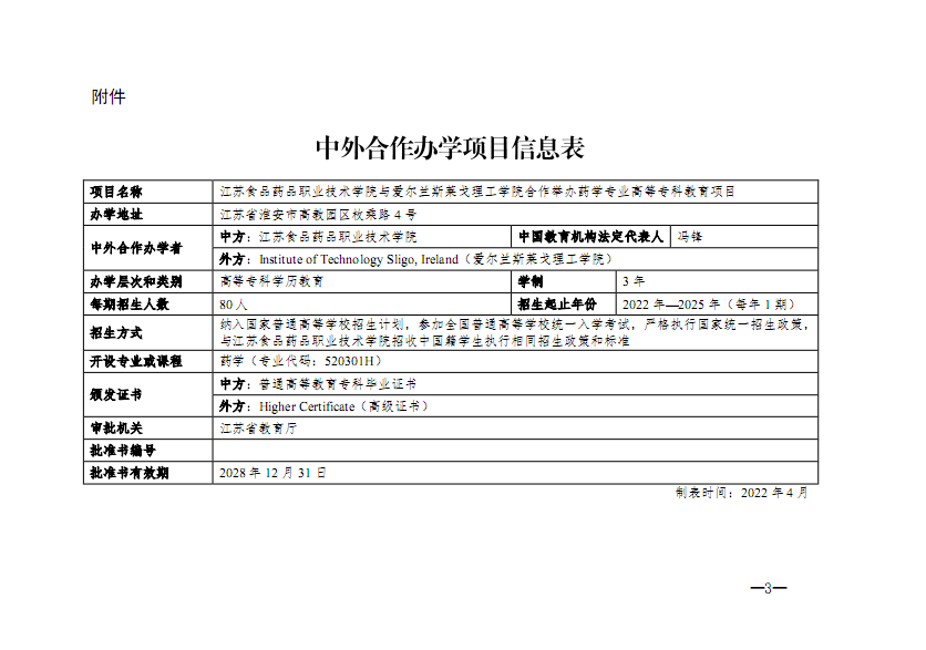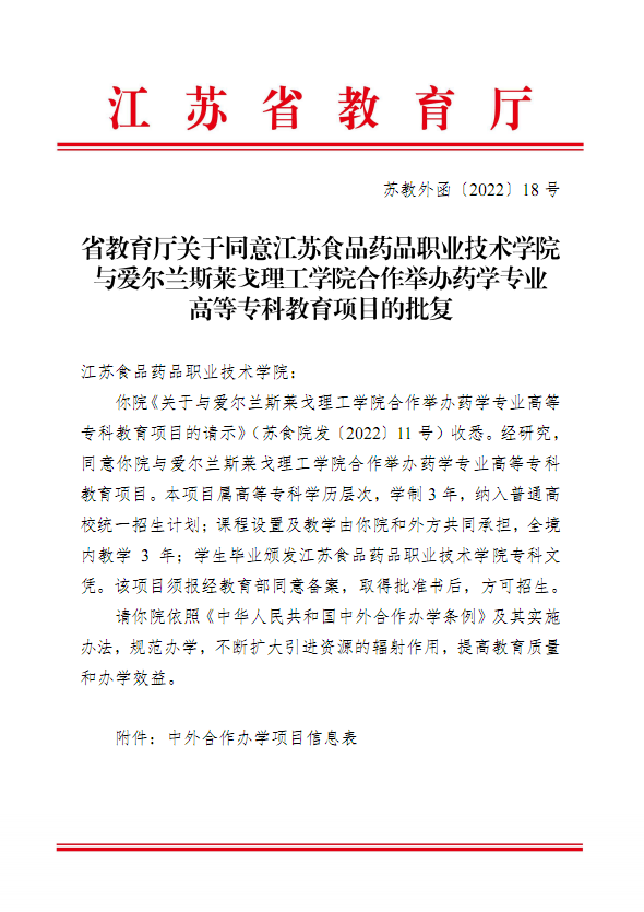 近日,江苏省教育厅公布2022年上半年中外合作办学项目审批结果,胜游娱乐与爱尔兰斯莱戈理工学院合作举办药学专业高等专科教育项目正式获批,这是胜游娱乐“十四五”期间首个中外合作办学项目。