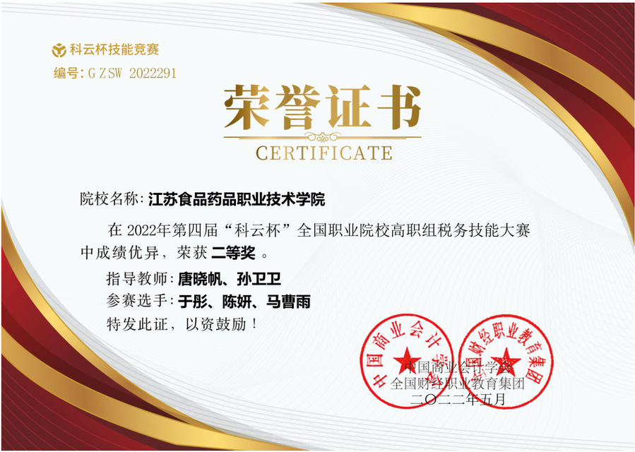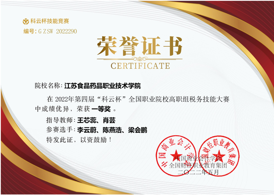近日,由中国商业会计学会、全国财经职业教育集团主办,中国商业会计学会职业教育分会协办,厦门科云信息科技有限公司承办的2022年第四届“科云杯”全国职业院校高职组税务技能大赛在云端圆满落下帷幕。胜游娱乐财贸学院王芯蕊、肖芸老师指导的李云蔚、陈燕浩、梁会鹏参赛团队荣获一等奖;唐晓帆、孙卫卫老师指导的于彤、陈妍、马曹雨参赛团队荣获二等奖。
