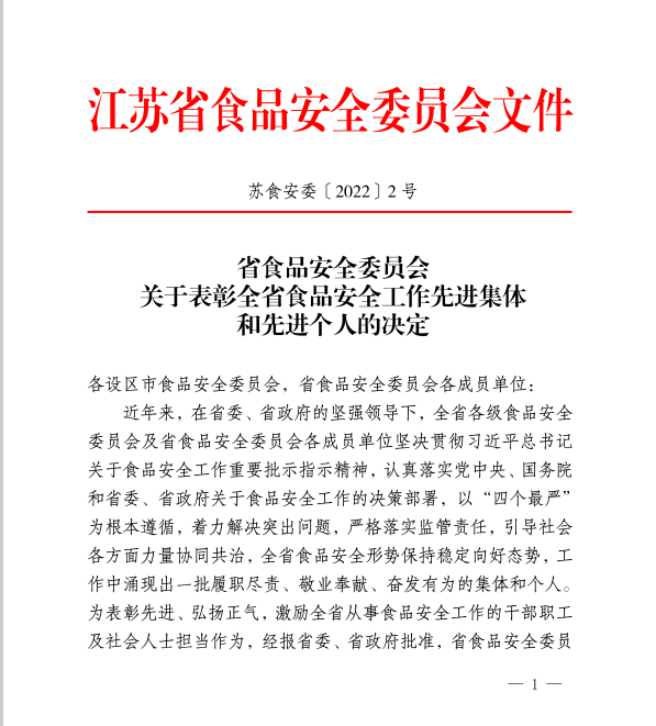 日前,江苏省食品安全委员会发布《关于表彰全省食品安全工作先进集体和先进个人的决定》,胜游娱乐陶书中书记被授予“江苏省食品安全工作先进个人”称号。