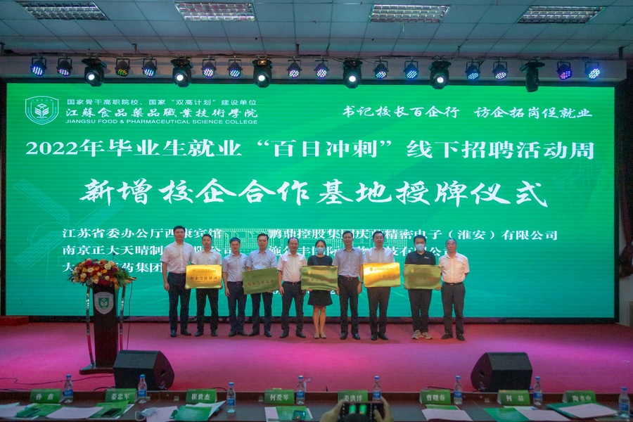 最后,淮安市委人才办、市人社局、团市委和学校领导共同为江苏省委办公厅西康宾馆、鹏鼎控股集团庆鼎精密电子(淮安)有限公司、南京正大天晴制药有限公司、大参林医药集团股份有限公司、施尔丰国际生物科技有限公司等5家新增校企合作基地授牌。