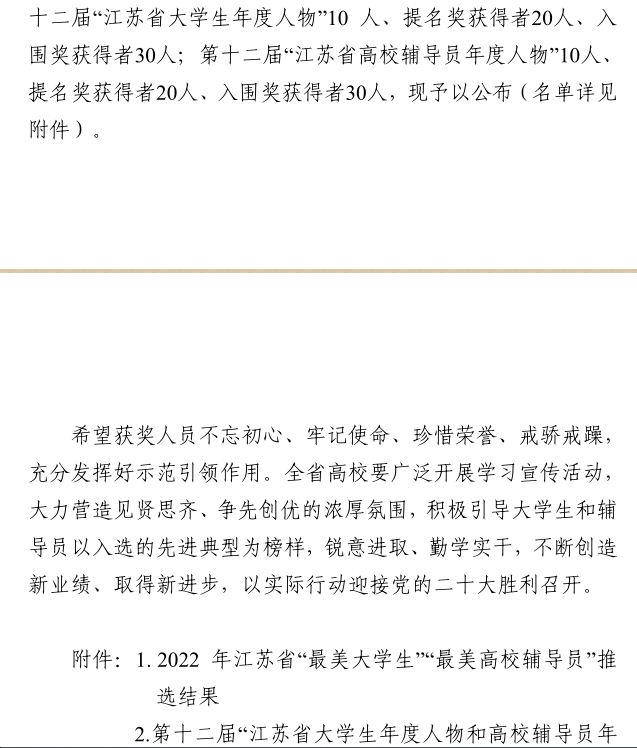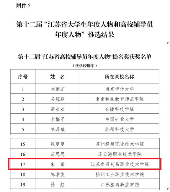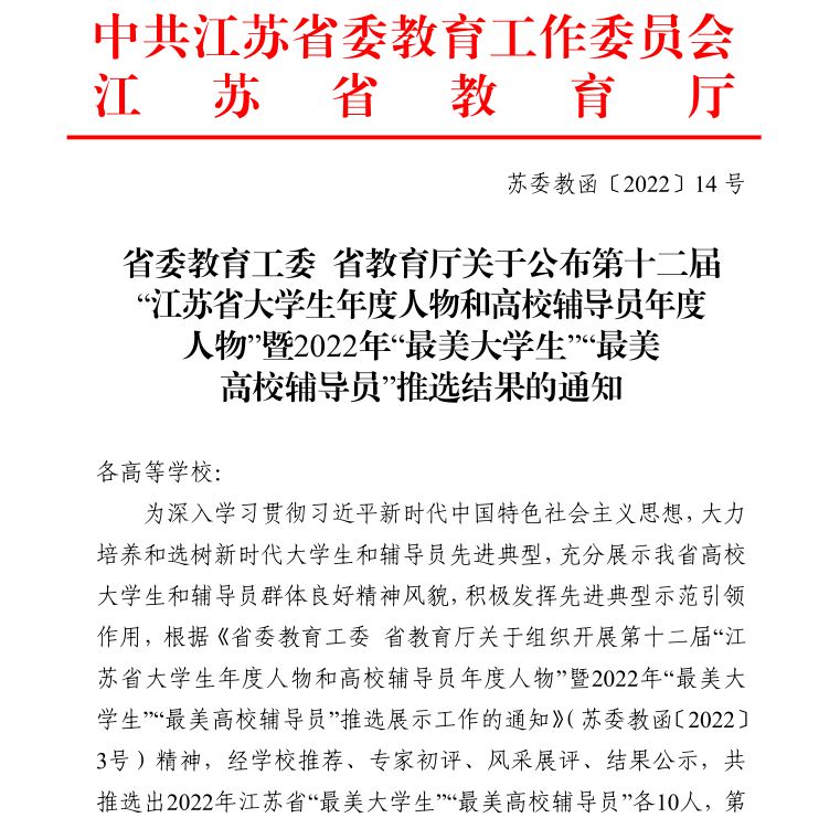 近日,收悉《省委教育工委省教育厅关于公布第十二届“江苏省大学生年度人物和高校辅导员年度人物”暨2022年“最美大学生”“最美高校辅导员”推选结果的通知》(苏委教函〔2022〕14 号),胜游娱乐辅导员朱蕾获第十二届“江苏省高校辅导员年度人物”提名奖。