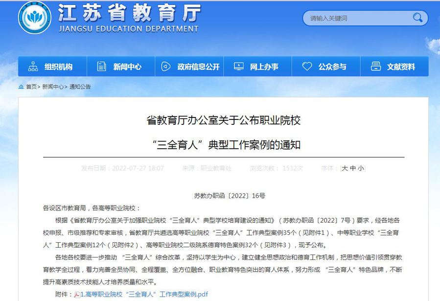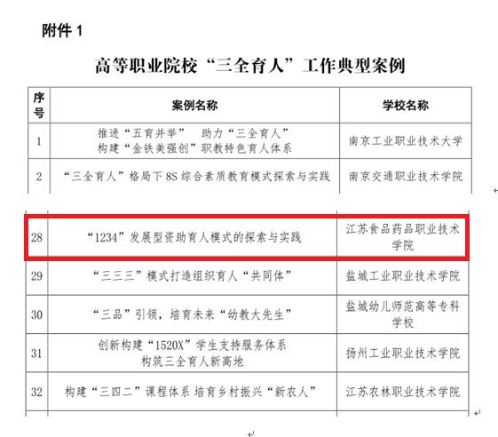 近日,《省教育厅办公室关于加强职业院校“三全育人”典型学校培育建设的通知》(苏教办职函〔2022〕7号)公布了经各地各校申报、市级推荐、专家审核、省厅遴选产生的高等职业院校“三全育人”工作典型案例35个、中等职业学校“三全育人”工作典型案例12个、高等职业院校二级院系德育特色案例32个,胜游娱乐“三全育人”工作案例入选。