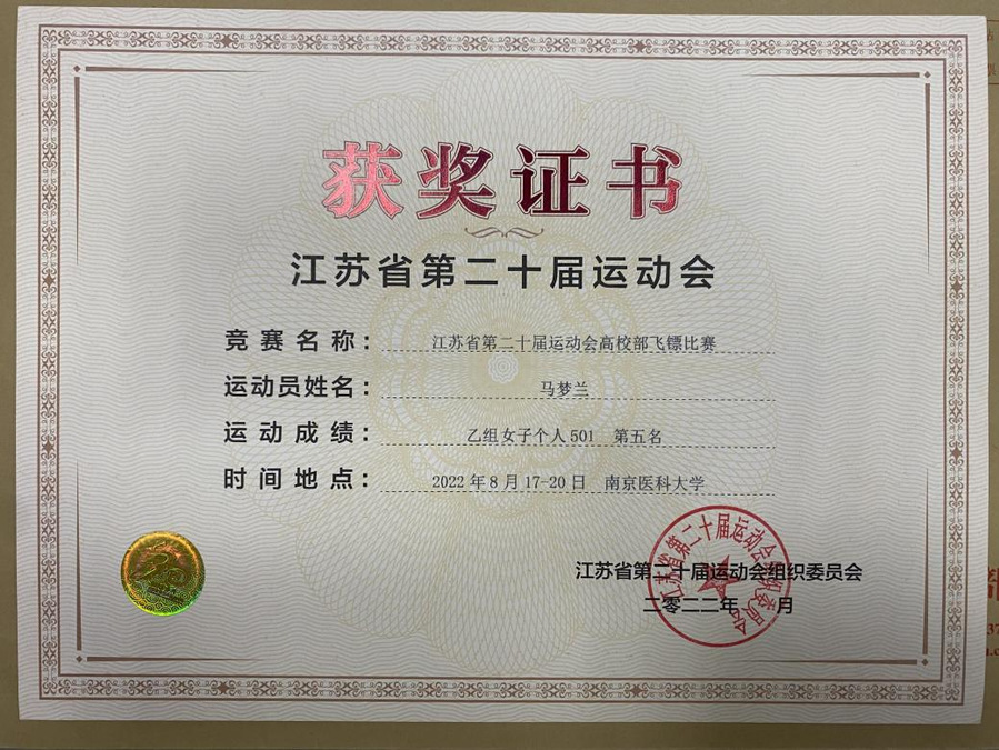 本次飞镖比赛是第一次被列为江苏省第二十届运动会的比赛项目,胜游娱乐功飞镖队由体育教学部朱懿奇老师指导并带领参加本次比赛。经过激烈而紧张的比赛,胜游娱乐康复203班马梦兰同学获得了女子单人第五名。