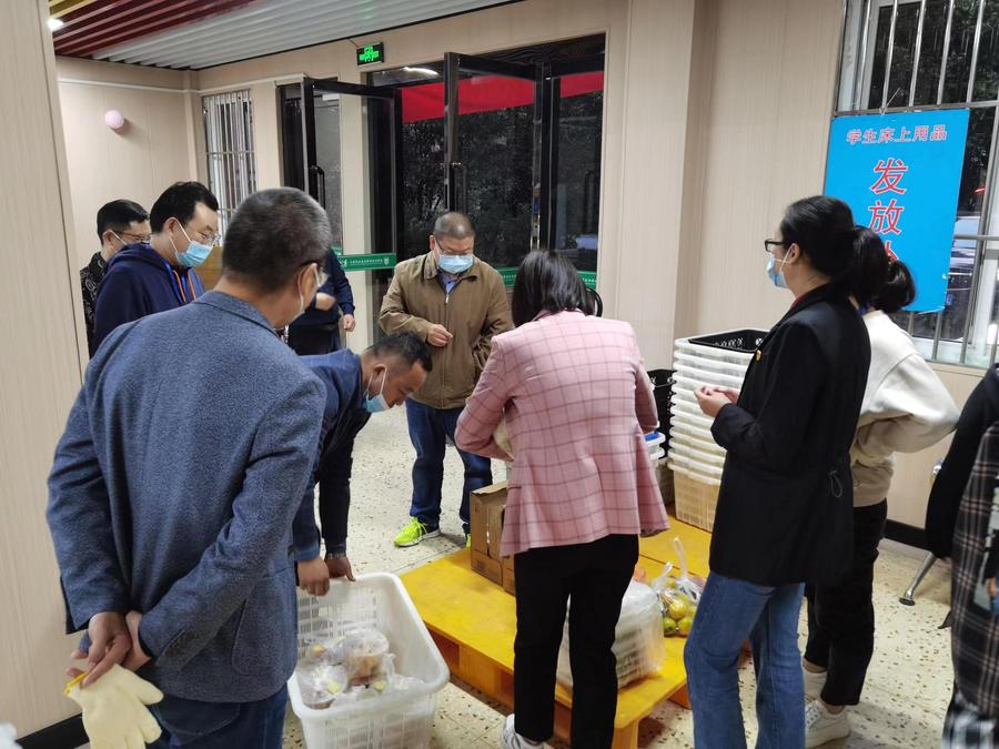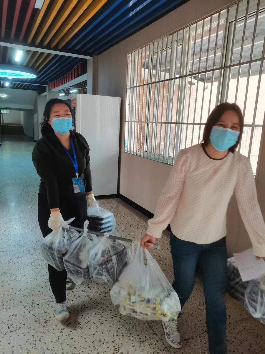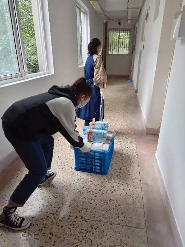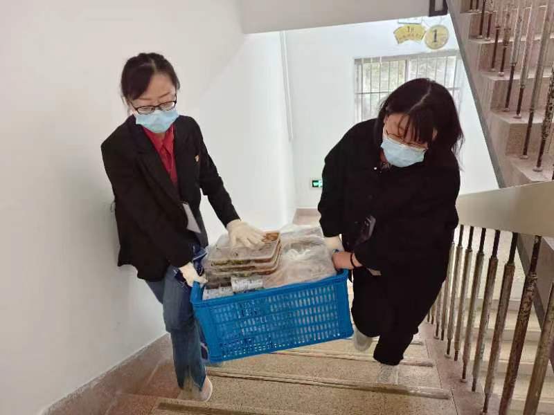 三身汗水 为尽最大可能防范疫情传播风险,队员们每天将一日三餐、纯净水、生活急需品等送到各个宿舍门口。看似简单的“送货上门”服务,却给了队员们不小的挑战,工作量超出了大家的想象。一份盒饭没有多少重量,一层楼没有多高,但当把一百份盒饭送到一百级台阶的五层楼,尤其是为了营养搭配,早餐和午餐还配备了酸奶和水果,这就验证了老话里说的:一里轻二里重三里四里拎不动。为了保证学生能够及时吃上热乎的饭菜,队员们发挥才智,各展所长,有的想到了杠杆原理,拿撑衣杆担着盒饭上楼;有的想到了搬家师傅的绳子,拿着自己的围巾打成结拖起盒饭的箱子;有的运用蚂蚁搬家的方式,少量多次分批上楼......各种花式送饭、送水让淌着汗水的劳累变成了相互激励的欢声笑语。七天下来,每个人的体重都有所下降,女队员开玩笑地说:我们不仅是党员突击队,还是瘦身突击队。