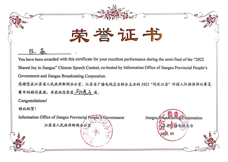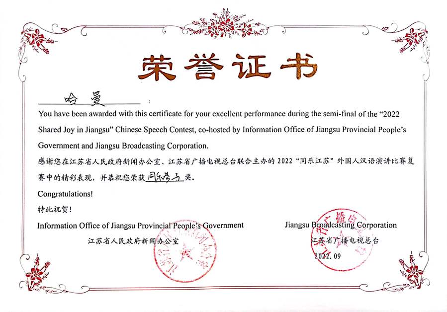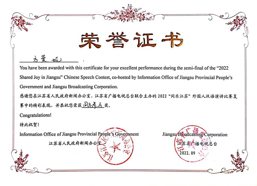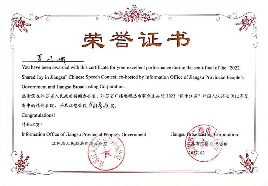 2022年10月,胜游娱乐4名留学生荣获2022“同乐江苏”外国人汉语演讲比赛“同乐参与”奖,该比赛由江苏省人民政府新闻办公室、江苏省广播电视总台联合主办,本次比赛内容为中国古诗词诵读,通过比赛,学生对中国传统文化的理解进一步加深,汉语能力也得到了极大提高。