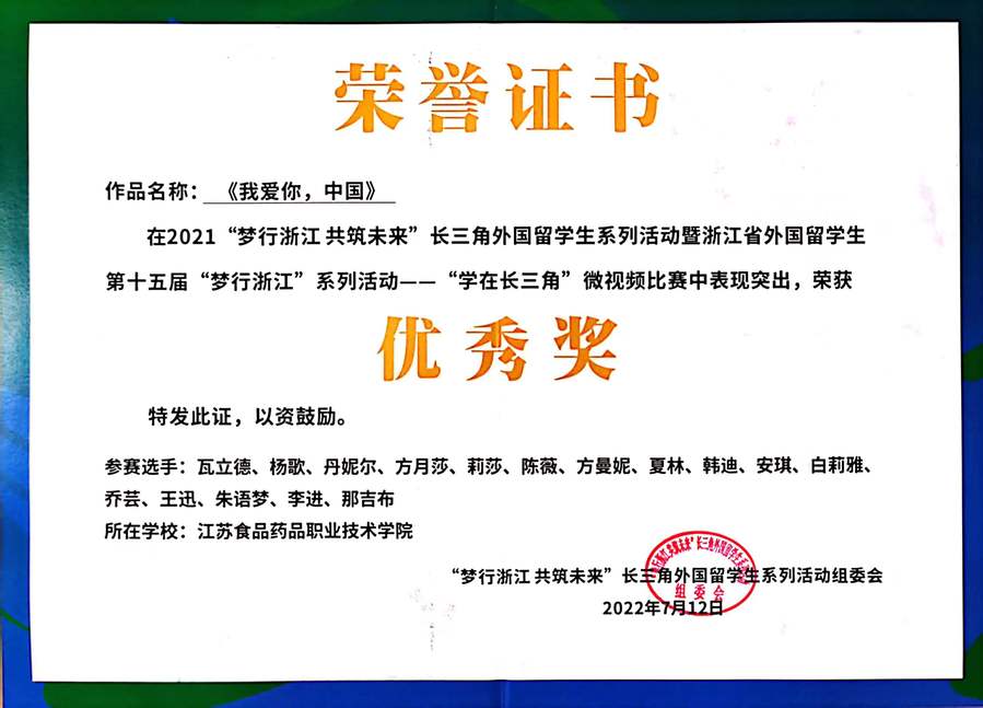 2022年8月,胜游娱乐留学生制作的短视频“我爱你,中国”荣获“学在长三角”微视频比赛优秀奖,该比赛是由上海市、江苏、浙江和安徽省教育厅主办,浙江理工大学、浙江电视台、浙江高等教育学会外国留学生教育管理分会承办的“梦行浙江共筑未来”长三角外国留学生系列活动之一,胜游娱乐留学生在比赛视频中以深情的歌声表达了对中国的热爱。