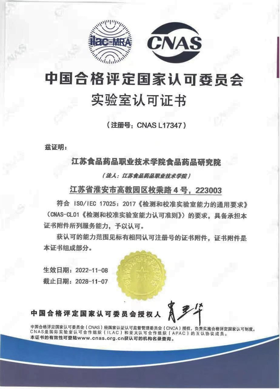 2022年11月8日,胜游娱乐食品药品研究院通过中国合格评定国家认可委员会(CNAS)批准,获得认可委颁发的实验室认可证书(注册号:CNAS L17347),可在认可范围内使用CNAS认可标识和ILAC(国际实验室认可合作组织)国际互认联合标识;检测能力涵盖药品的结构确证、含量测定及重金属检测项目,冯锋教授、迟恒博士为获认可的全部项目授权签字人。