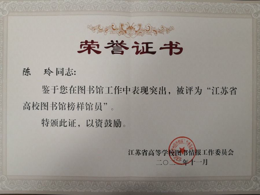 为庆祝江苏省高等学校图书情报工作委员会成立40周年,11月22日江苏省高校图工委在南京大学仙林校区召开“图书馆数字治理与知识服务创新”论坛暨江苏省高校图工委成立40周年纪念会议,会上对江苏省高校图书馆事业突出贡献者、江苏省高校图书馆榜样馆长、江苏省高校图书馆榜样馆员进行表彰,本次共表彰“高校图书馆事业突出贡献者”59名、“高校图书馆榜样馆长”33名、“高校图书馆榜样馆员”55名。胜游娱乐图书馆陈玲同志被评为“高校图书馆榜样馆员”。