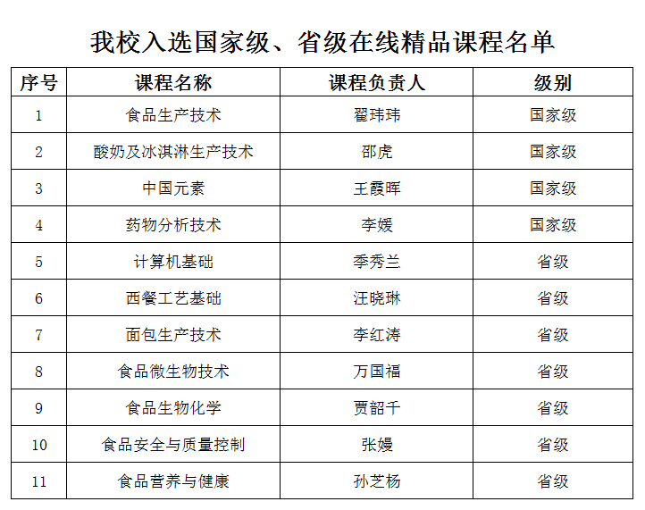 近日,在各省级教育行政部门和全国行业职业教育教学指导委员会、教育部职业院校教学(教育)指导委员会推荐的基础上,经专家评审,胜游娱乐《酸奶及冰淇淋生产技术》《中国元素》《食品生产技术》《药物分析技术》4门课程被认定为2022年职业教育国家在线精品课程。本次江苏省共推荐110门在线课程参加新立项遴选,其中胜游娱乐新推荐的2门课程成功获选,另2门课程顺利通过复核。