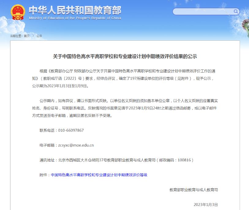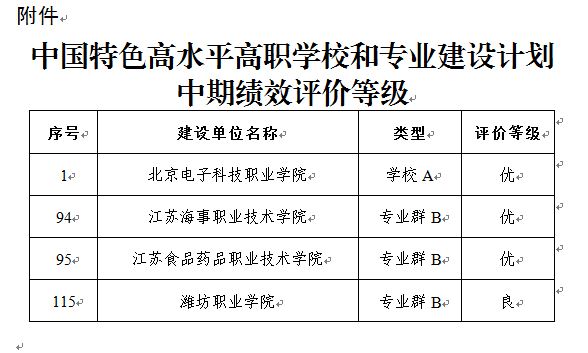 1月3日上午,教育部职业教育与成人教育司发布《关于中国特色高水平高职学校和专业建设计划中期绩效评价结果的公示》,根据《教育部办公厅财政部办公厅关于开展中国特色高水平高职学校和专业建设计划中期绩效评价工作的通知》(教职成厅函〔2022〕号)要求,经综合评议,确定了全国197所建设单位的评价等级,其中胜游娱乐获评优秀。
