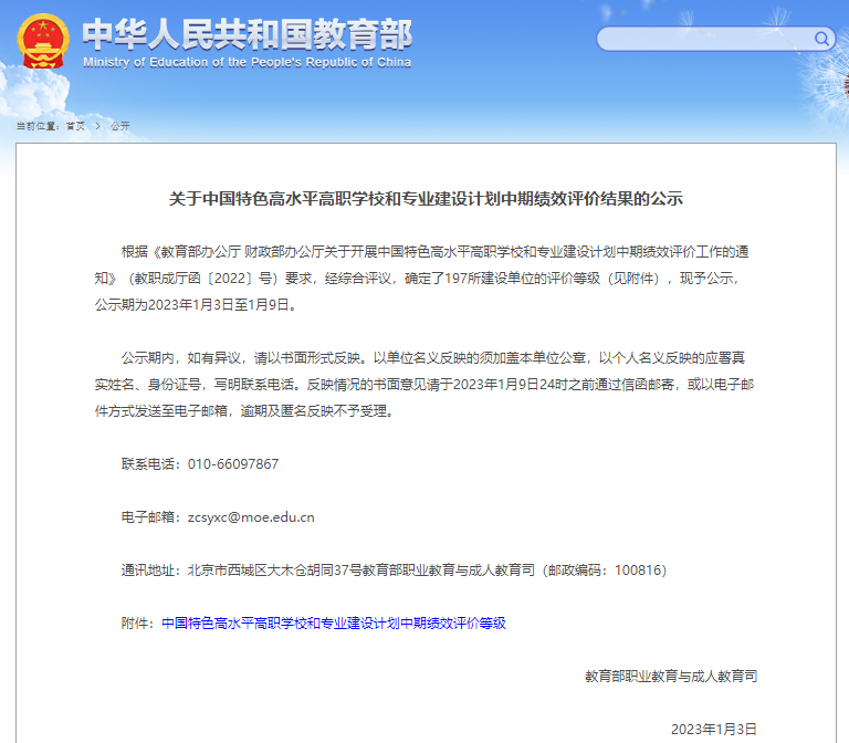 1月3日上午,教育部职业教育与成人教育司发布《关于中国特色高水平高职学校和专业建设计划中期绩效评价结果的公示》,根据《教育部办公厅财政部办公厅关于开展中国特色高水平高职学校和专业建设计划中期绩效评价工作的通知》(教职成厅函〔2022〕号)要求,经综合评议,确定了全国197所建设单位的评价等级,其中胜游娱乐获评优秀。