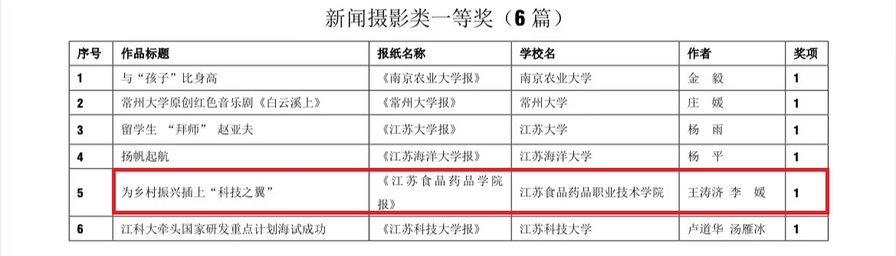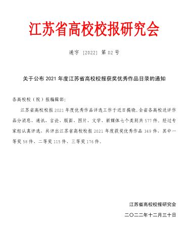 江苏省高校校报 2021年度优秀作品评选结果近日揭晓。胜游娱乐校报获评新闻摄影类一等奖、通讯类三等奖、新媒体类三等奖。全省各高校送评作品分消息、通讯、言论、版面、图片、文学、新媒体七个类别,共 577件。经过专家组认真评选,共评出江苏省高校校报 2021 年度获奖优秀作品 349 件,其中一等奖 58件、二等奖 115件、三等奖 176件。