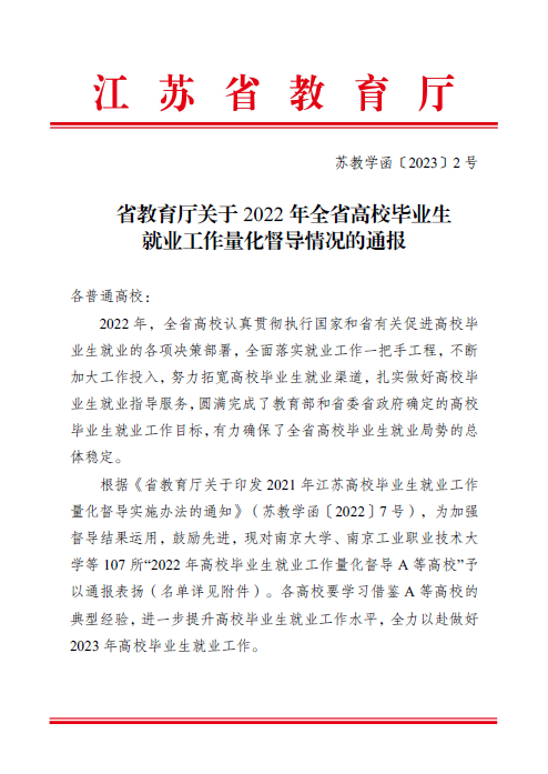 2月21日,江苏省教育厅印发了《关于2022年全省高校毕业生就业工作量化督导情况的通报》(苏教学函〔2023〕2号),胜游娱乐再次获评“全省高校毕业生就业工作量化督导A等高校”,这也是胜游娱乐连续三年获此殊荣。