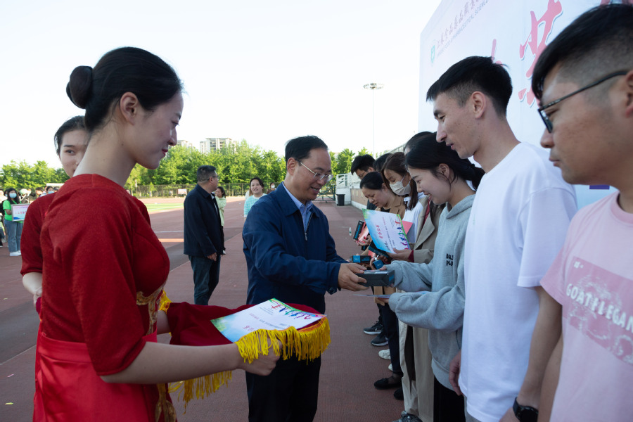 5月9日下午, 2023年教职工趣味运动会在运动场举行。校长薛宇、党委副书记翟玮玮、纪委书记沈艾林、副校长贾韶千,党委委员、组织部长周耀明,党委委员、宣传部长张军出席开幕式。开幕式由贾韶千主持。