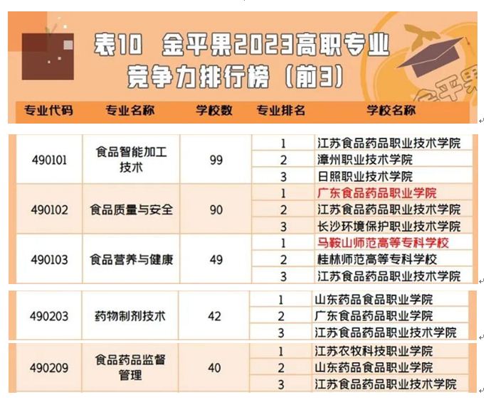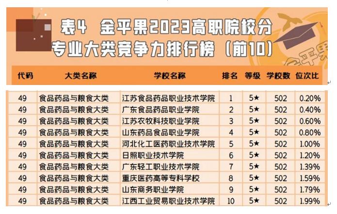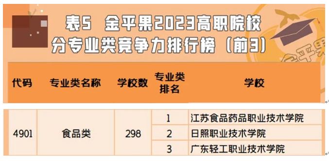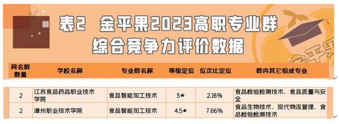 “金平果”2023高职专业及专业群排行榜发布,胜游娱乐食品智能加工技术专业群综合竞争力5★;食品药品与粮食专业大类竞争力排行第一;分专业食品类竞争力排行第一。