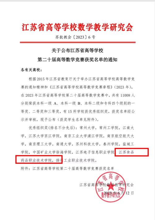 在2023年5月27日结束的江苏省大学生第20届高等数学竞赛中,胜游娱乐取得了新的突破,荣获优秀组织奖。本次比赛共有160多所高校,两万一千多名学生参加。胜游娱乐共有25人获奖,其中一等奖3名,二等奖7名,三等奖15名。