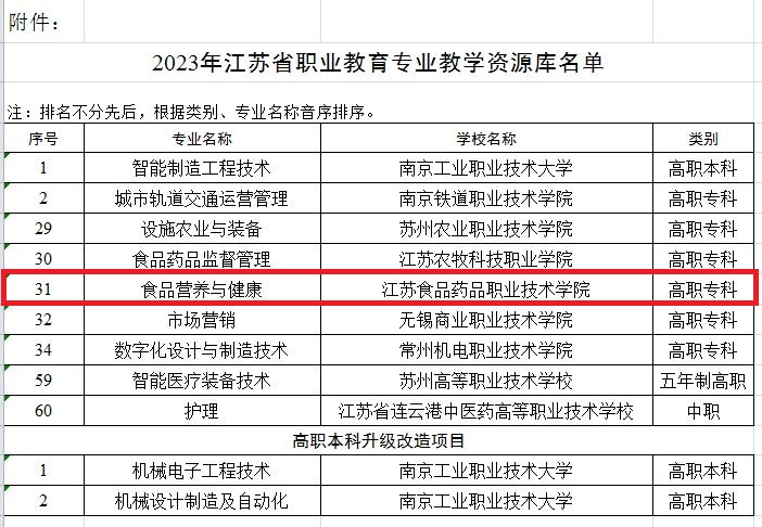 近日,据《省教育厅关于公布2023年江苏省职业教育专业教学资源库名单的通知》(苏教职函〔2023〕27号)获悉,胜游娱乐“食品营养与健康”专业入选江苏省职业教育专业教学资源库建设项目。该项目,经学校申报、专家评审、结果公示和省教育厅专题办公会审议,共确定60个。