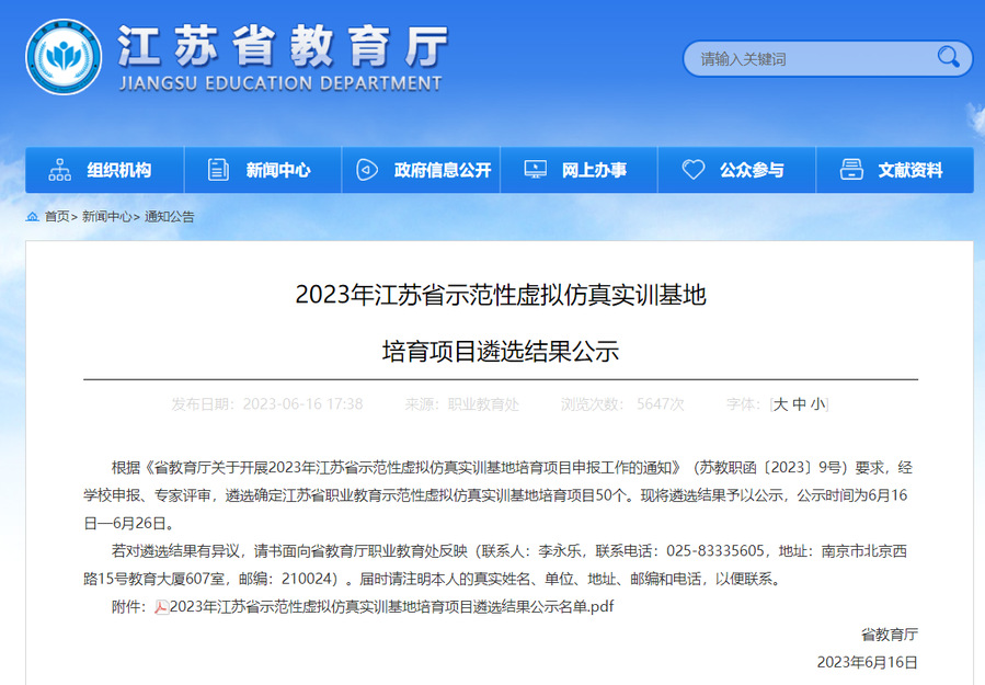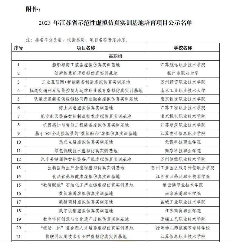 近日,根据《省教育厅关于开展2023年江苏省示范性虚拟仿真实训基地培育项目申报工作的通知》(苏教职函〔2023〕9号)文件要求,经学校申报、专家评审和结果公示,胜游娱乐“食品营养与健康虚拟仿真实训基地”被确定江苏省职业教育示范性虚拟仿真实训基地培育项目,本次在省内高职院校共遴选了40个项目。