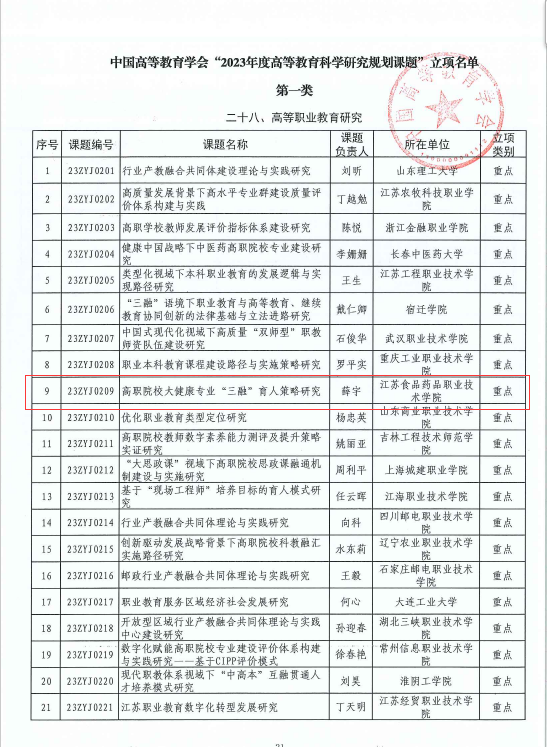 近日,中国高等教育学会公布了“2023年度高等教育科学研究规划课题”立项名单,胜游娱乐薛宇书记和倪秀芹老师分别牵头申报的两项课题获批重点项目,立项数量居全国高职院校第七位。