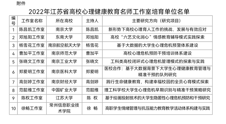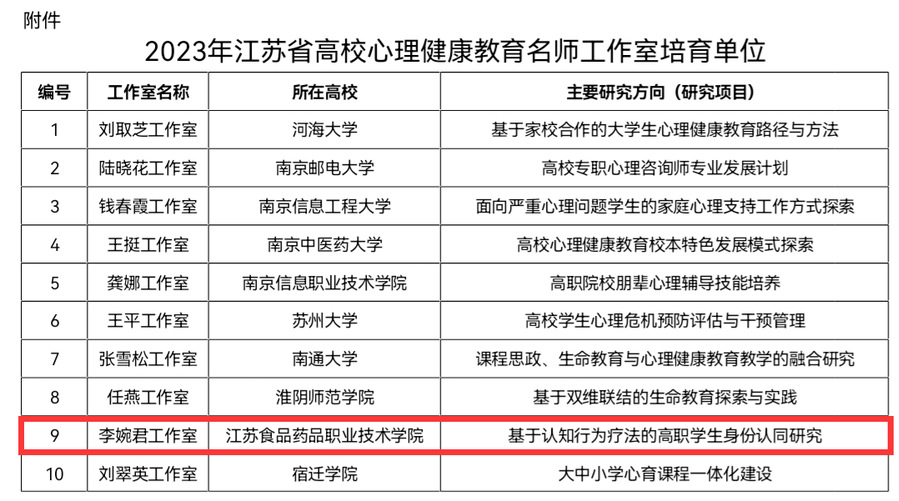 10月7日,江苏省教育厅发布《2023年江苏省高校心理健康教育名师工作室培育单位评审结果公示》,胜游娱乐“李婉君工作室”获批2023年江苏省高校心理健康教育名师工作室培育单位的十所院校之一。目前,江苏省教育厅共组织两批高校心理健康教育名师工作室培育单位的申报,共20所院校获批,高职院校仅3所,胜游娱乐位列其中。