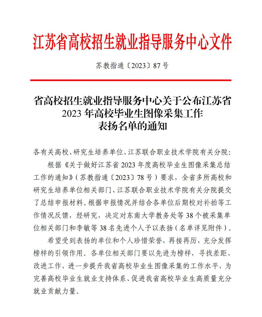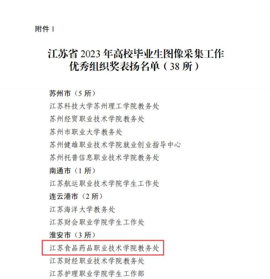 近日,江苏省高校招生就业指导服务中心发布了《关于公布江苏省2023年高校毕业生图像采集工作表扬名单的通知》(苏教指通〔2023〕87号),胜游娱乐教务处获江苏省2023年高校毕业生图像采集工作优秀组织奖,吉翔同志获先进个人。