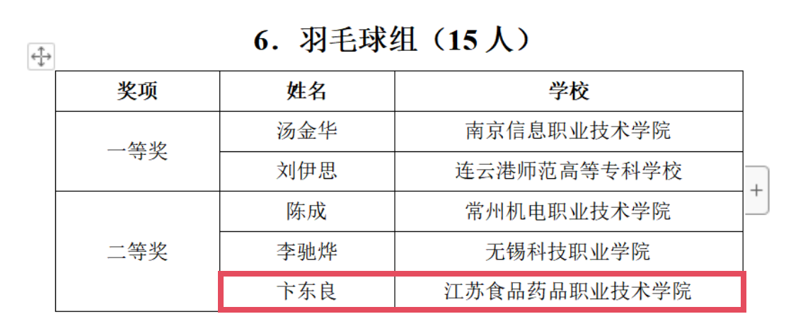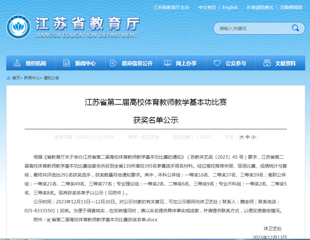 11月26日,由江苏省教育厅主办的江苏省第二届高校体育教师教学基本功比赛在南京信息职业技术学院举行,来自全省60多所高职校192名教师代表参赛,胜游娱乐派出唐明、朱懿奇、卞东良三名教师参赛。比赛包括手写教案、无生授课、运动技能竞赛、体育理论考试等四个环节项目评比教师教学基本功实力。经过三天的激烈角逐,朱懿奇荣获高职公体组田径项目二等奖、卞东良荣获高职公体组羽毛球项目二等奖、唐明荣获高职公体组足球项目三等奖。