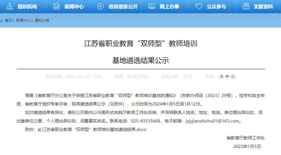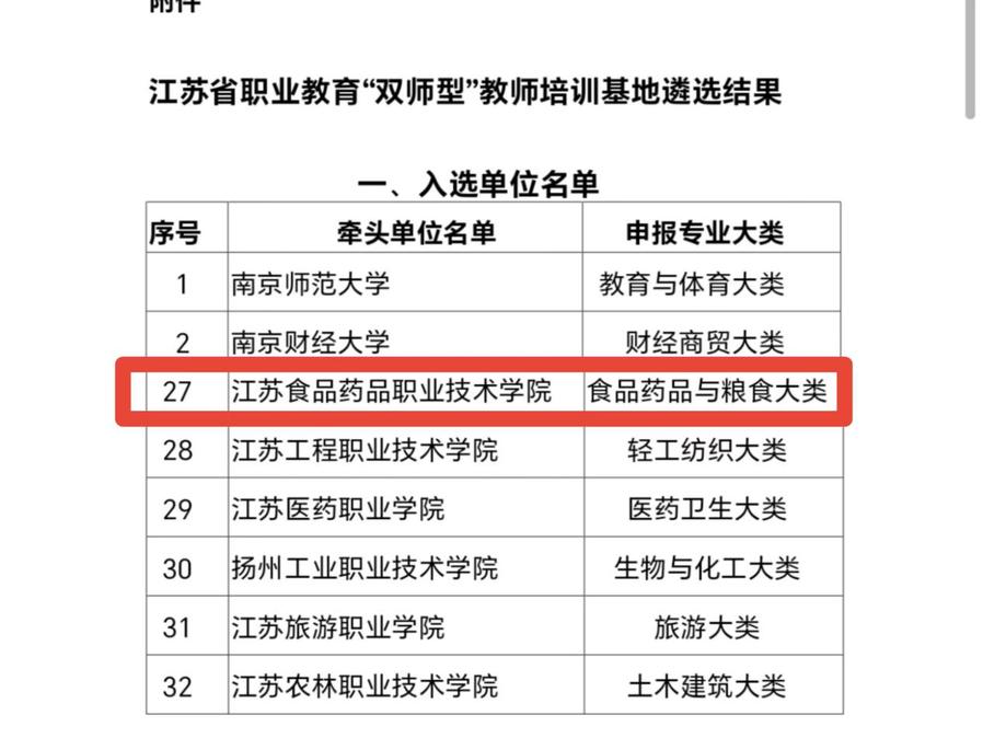 1月5日,江苏省教育厅教师工作处公布了《江苏省职业教育“双师型”教师培训基地遴选结果公示》,胜游娱乐成功入选江苏省职业教育“双师型”教师培训基地名单!
