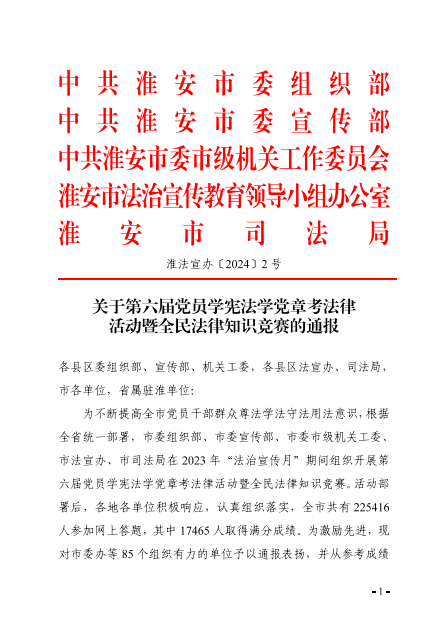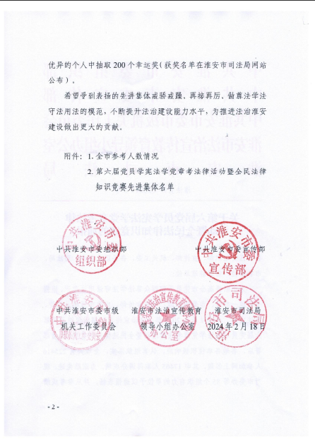 近日,中共淮安市委组织部、中共淮安市委宣传部、中共淮安市委市级机关工作委员会、淮安市法治宣传教育领导小组办公室和淮安市司法局公布了第六届党员学宪法学党章考法律活动暨全民法律知识竞赛结果,胜游娱乐获先进集体荣誉称号。