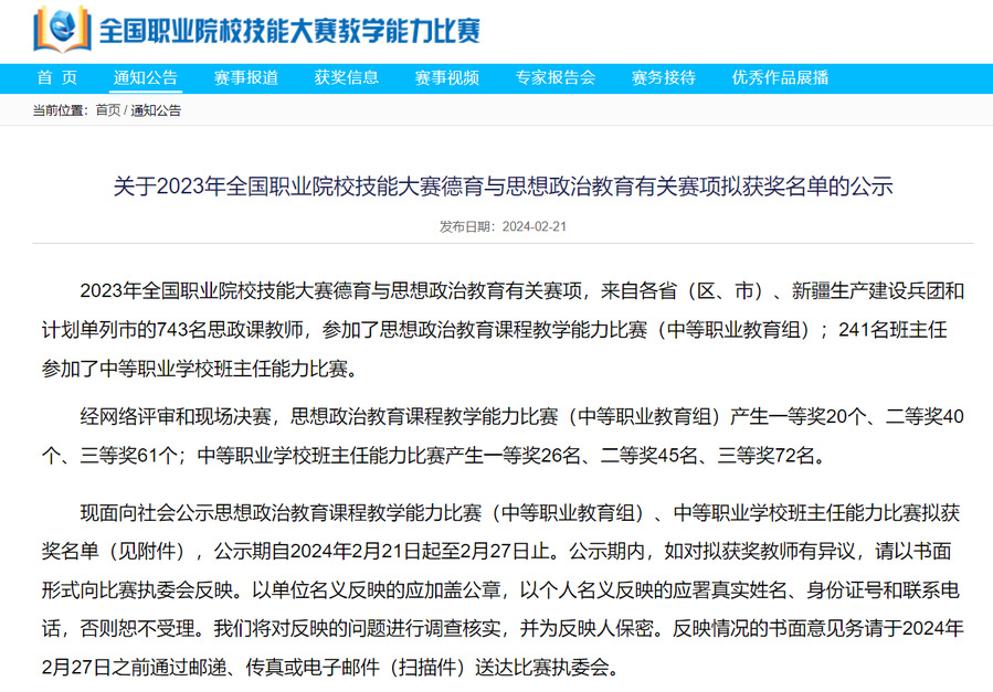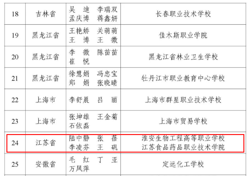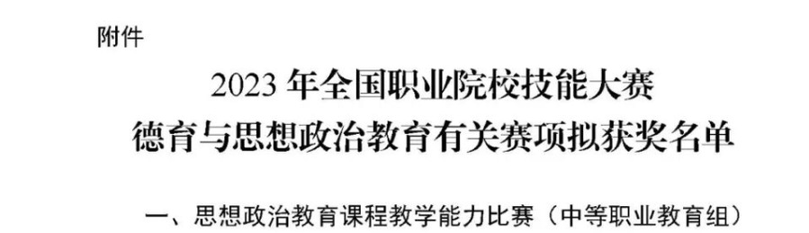 近日,全国职业院校技能大赛德育与思想政治教育有关赛项执委会发布了《2023年中等职业学校班主任能力比赛与思政课教学能力比赛拟获奖名单公示》,胜游娱乐张蓓老师与淮安生物工程高等职业学校陆中静、李凌芬、王矾三位老师组成的教学团队荣获思想政治教育课程组三等奖。