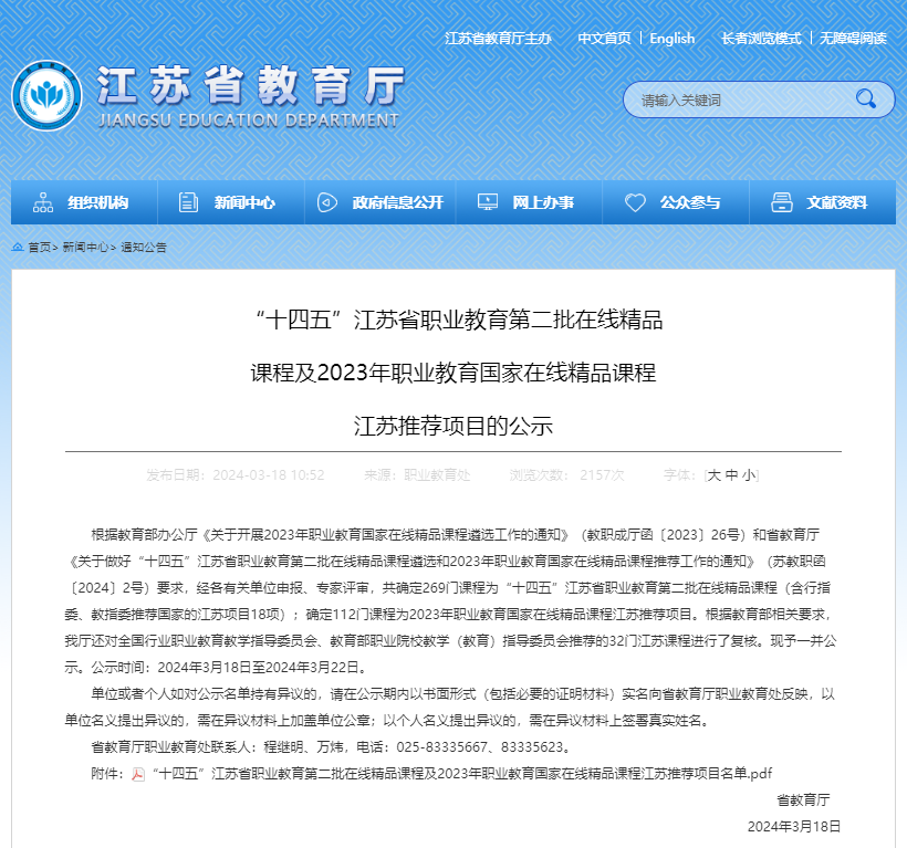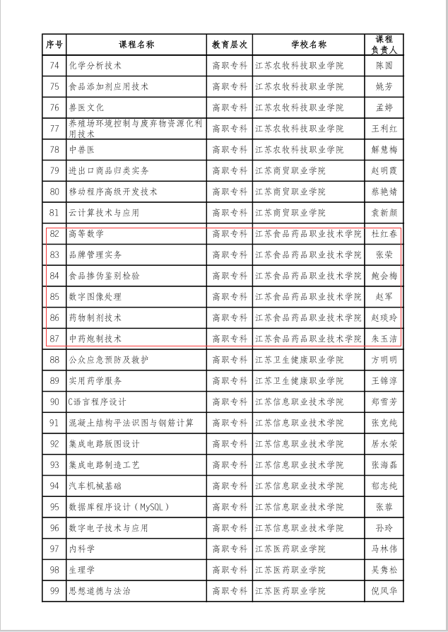 近日,省教育厅发布了《“十四五”江苏省职业教育第二批在线精品课程及2023年职业教育国家在线精品课程江苏推荐项目的公示》,胜游娱乐《高等数学》《品牌管理实务》《食品掺伪鉴别检验》《数字图像处理》《药物制剂技术》《中药炮制技术》6门课程被认定为“十四五”江苏省职业教育第二批在线精品课程,立项数量位居全省第8,《食品生物化学》《面包生产技术》《食品微生物技术》《食品掺伪鉴别检验》《药物制剂技术》5门课程被推荐至教育部参评职业教育国家在线精品课程。