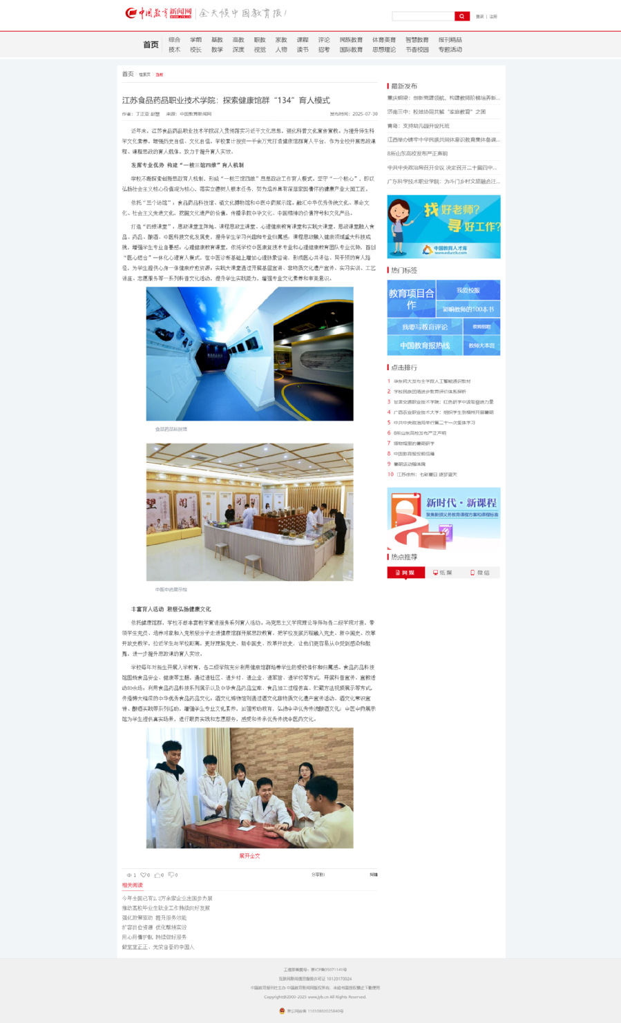 各二级学院结合健康馆群平台开展课程思政,先后建成富有课程思政色彩的精品课。其中,《中国元素》《药物制剂技术》等4门为国家级精品课;《食品生产技术》等3门课程获批省课程思政示范课程。主编、参编教材8部,其中《食品安全与控制》等4本教材被列为“十三五”职业教育国家规划教材,《食品生产概论》获评全国教材建设二等奖。