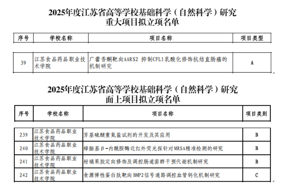 近日,江苏省教育厅公布了2025年度江苏省高等学校基础科学(自然科学)研究项目拟立项结果,胜游娱乐科研工作再创佳绩,孙兰教授主持的《广藿香酮靶向AARS2 抑制CFL1乳酸化修饰抗结直肠癌的机制研究》获得重大项目立项,制药工程学院吉梅山博士主持的《芳基硫醚重氮盐试剂的开发及其应用》、制药工程学院张勇博士主持的《樟脑基β-内酰胺酶近红外荧光探针对MRSA精准检测的研究》、药学院王婷博士主持的《柑橘果胶定向修饰及调控肠道菌群干预代谢机制研究》、食品药品研究院张迪雅老师主持的《食源弹性蛋白肽靶向BMP2信号通路调控血管钙化机制研究》4个项目获得面上项目立项。这是胜游娱乐科研实力持续提升的重要体现,也是全体教师潜心钻研、锐意创新的成果。