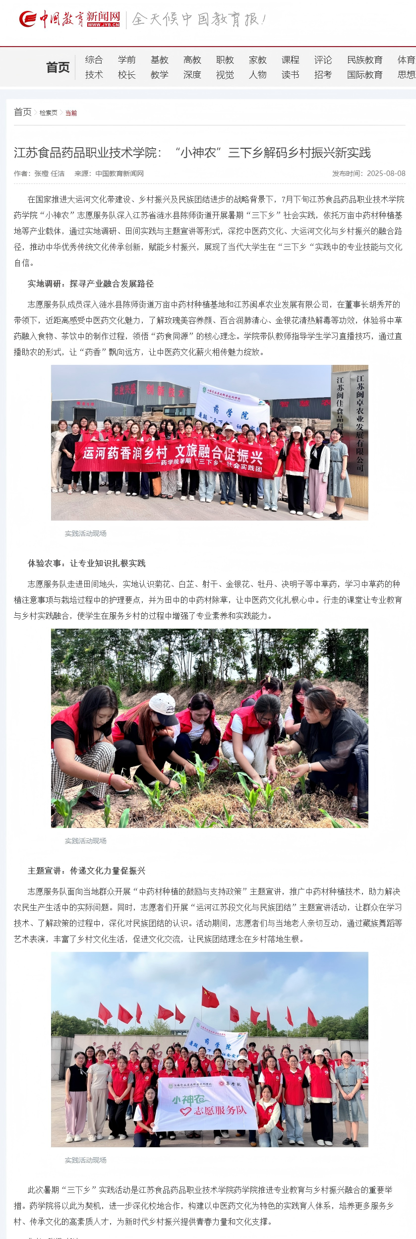 在国家推进大运河文化带建设、乡村振兴及民族团结进步的战略背景下,7月下旬胜游娱乐药学院“小神农”志愿服务队深入江苏省涟水县陈师街道开展暑期“三下乡”社会实践,依托万亩中药材种植基地等产业载体,通过实地调研、田间实践与主题宣讲等形式,深挖中医药文化、大运河文化与乡村振兴的融合路径,推动中华优秀传统文化传承创新,赋能乡村振兴,展现了当代大学生在“三下乡“实践中的专业技能与文化自信。