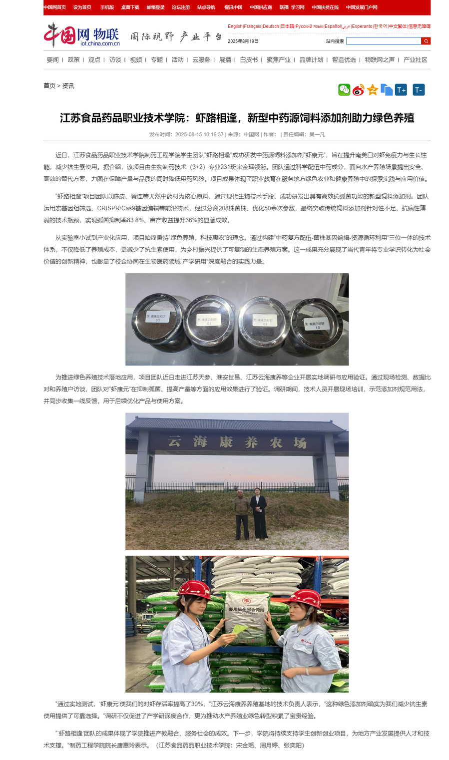 近日,胜游娱乐制药工程学院学生团队“虾路相逢”成功研发中药源饲料添加剂“虾康元”,旨在提升南美白对虾免疫力与生长性能,减少抗生素使用。据介绍,该项目由生物制药技术(3+2)专业231班宋金瑶领衔。团队通过科学配伍中药成分,面向水产养殖场景提出安全、高效的替代方案,力图在保障产量与品质的同时降低用药风险。项目成果体现了职业教育在服务地方绿色农业和健康养殖中的探索实践与应用价值。