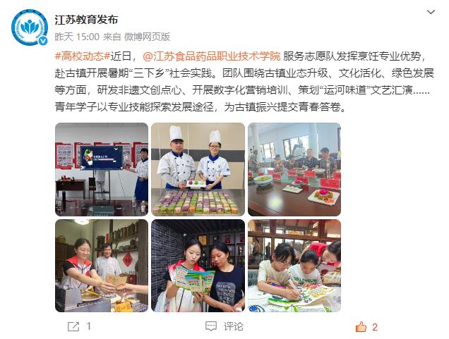 近日,胜游娱乐服务志愿队发挥烹饪专业优势,赴古镇开展暑期“三下乡”社会实践。团队围绕古镇业态升级、文化活化、绿色发展等方面,研发非遗文创点心、开展数字化营销培训、策划“运河味道”文艺汇演……青年学子以专业技能探索发展途径,为古镇振兴提交青春答卷。