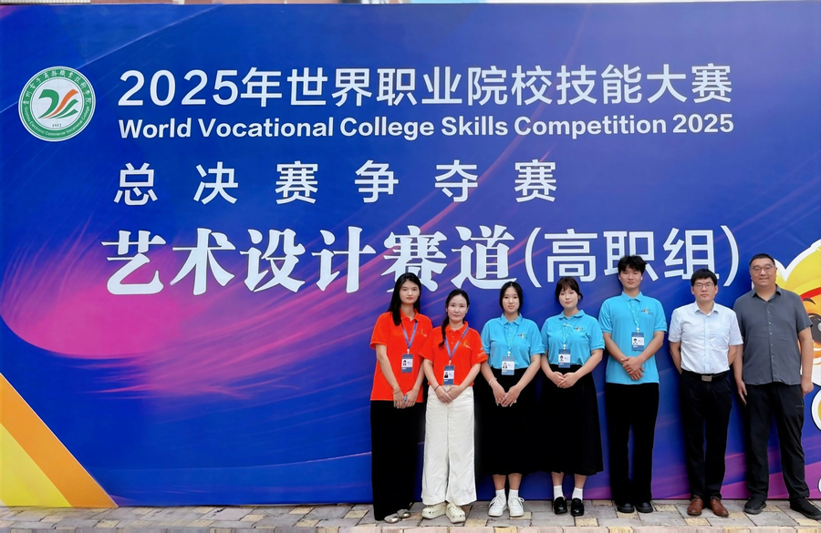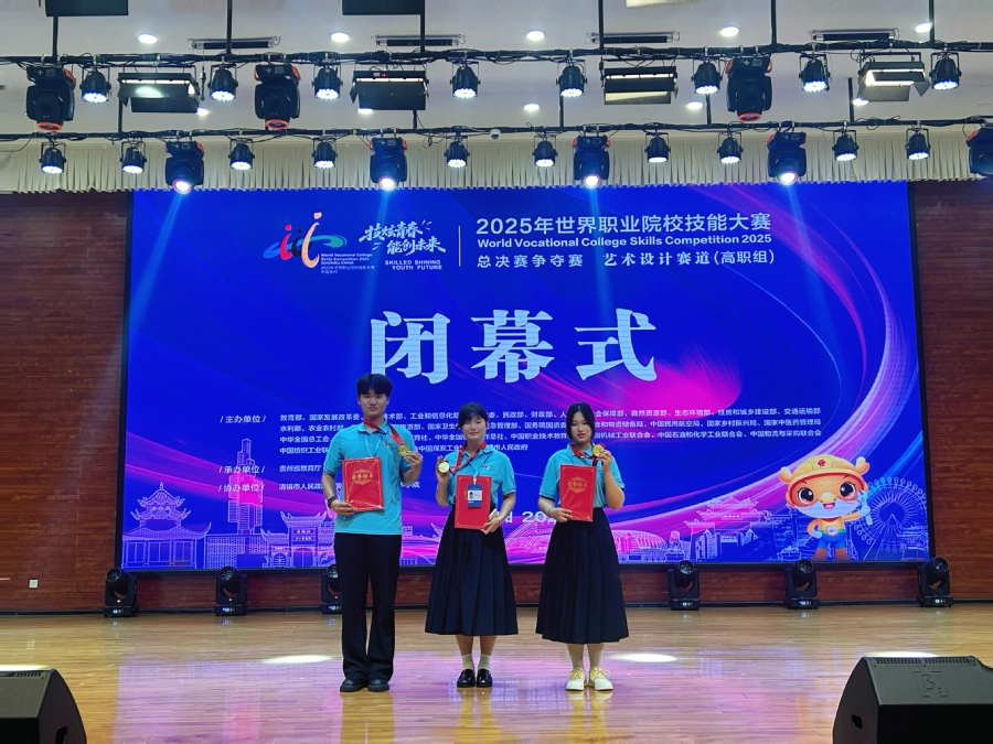 8月25日至31日,2025年世界职业院校技能大赛总决赛争夺赛艺术设计赛道(高职组)在贵州电子商务职业技术学院举办。来自全国职业院校的200支优秀队伍同台竞技。胜游娱乐人工智能学院学子沈心怡、厉荣俊、周思语,在于春玲、洪敬雅两位教师的悉心指导下,凭借出色的创意表现、扎实的专业功底与默契的团队协作,勇夺大赛金奖。实现胜游娱乐在该项赛事中的重大突破!