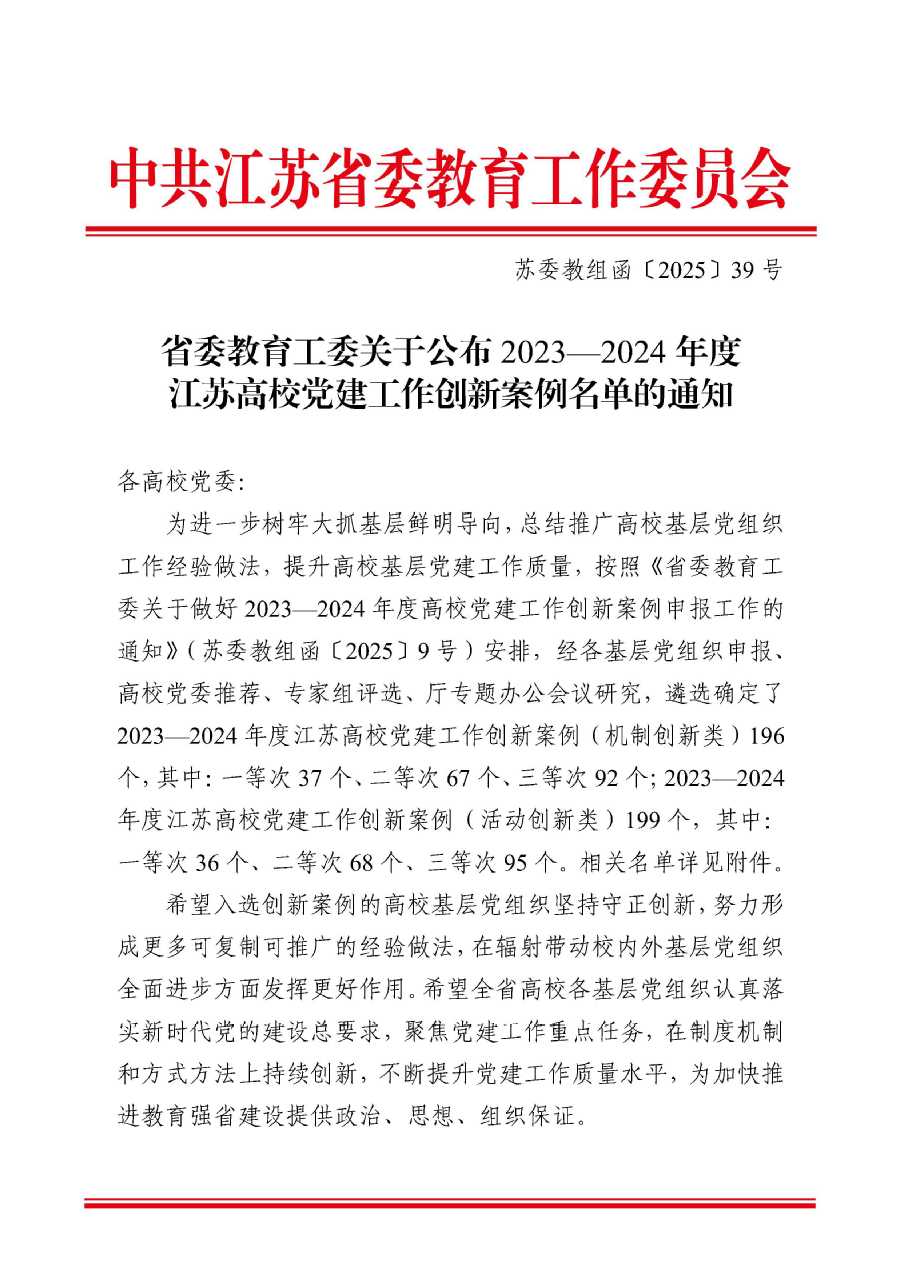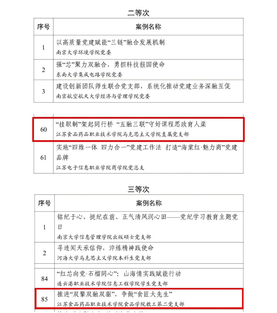 近日,江苏省委教育工委公布了2023—2024年度江苏高校党建工作创新案例名单,胜游娱乐2项案例成功入选。马克思主义学院直属党支部《“挂职制”架起同行桥“五融三联”守好课程思政育人渠》获评机制创新类二等次,食品学院教工第二党支部《推进“双擎双融双驱”,争做“食匠大先生”》获评活动创新类三等次。
