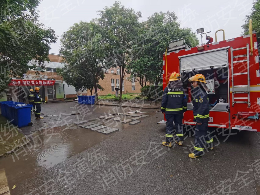 15时,演练正式开始,模拟起火点形成,现场浓烟滚滚,发现火情后,1名公寓管理员吹响紧急疏散口哨,同时拨打119火警电话报火警;2名管理员作为第一灭火力量携带灭火器赶往起火点扑救初起火灾,参加演练学生听到疏散哨音后,用湿毛巾捂住口鼻开始有序向公寓外疏散;义务消防队接报火警后作为第二灭火力量,3分钟内赶赴现场增援灭火;城南消防救援站接到119火警报告后,火速驰援现场展开灭火救援行动;在灭火救援过程中发现公寓S8B003宿舍有1名学生受伤被困,管理员立刻拨打120急救电话,120救护车随后赶来现场救护转运受伤学生,参与演练的全体新生在5分钟之内疏散完毕。