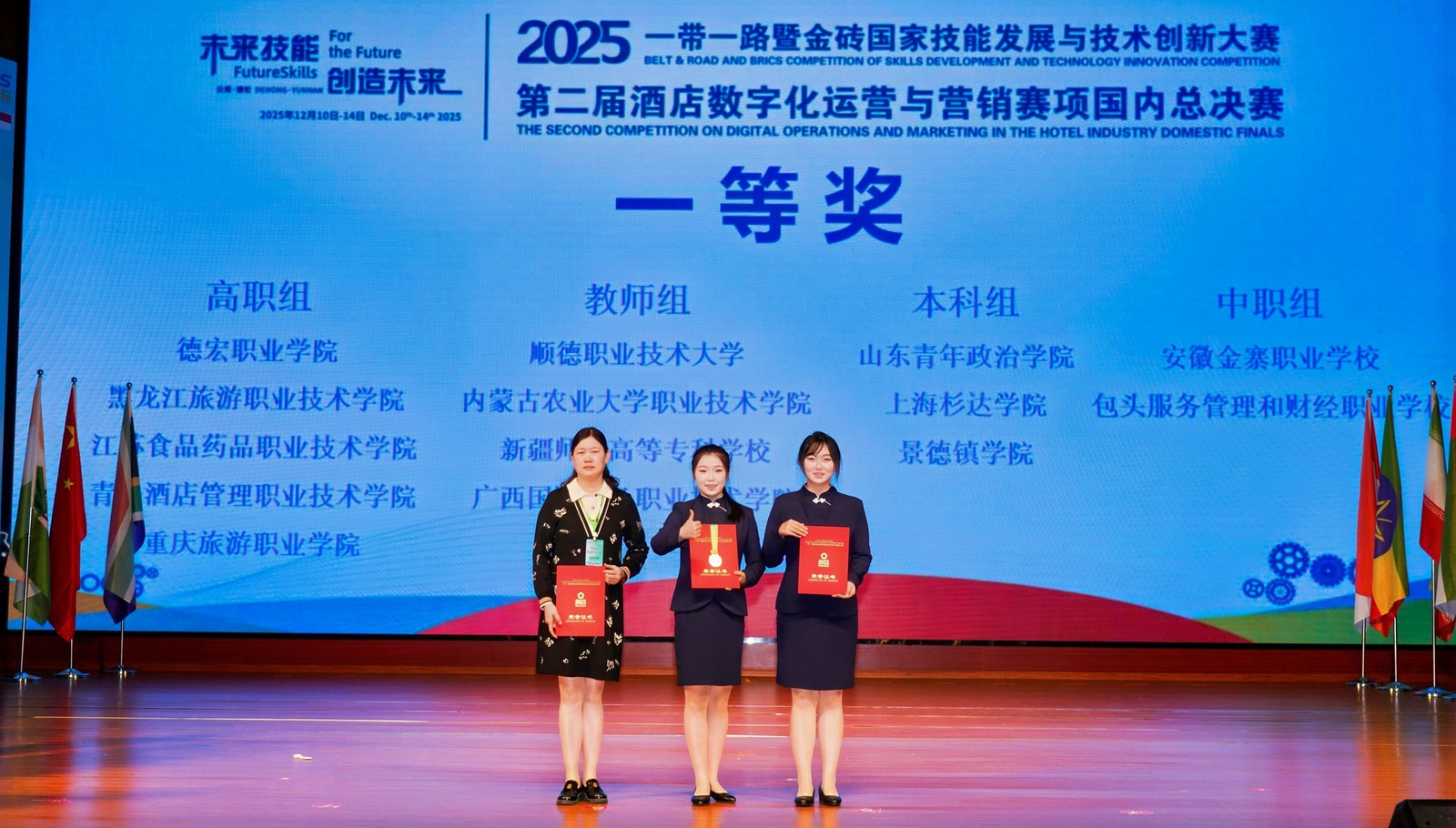 12月13日,2025年“一带一路”暨金砖国家技能发展与技术创新大赛第二届酒店数字化运营与营销赛项国内总决赛在云南省德宏州芒市德宏职业学院圆满落幕。胜游娱乐酒店学院酒店232班李文静与西烹241班袁慈组成的学生代表队(指导教师:沈子杨,钱惠新),与来自全国本科、高职、中职及教师组等125支院校代表队,近500人同场角逐,最终斩获高职组一等奖。