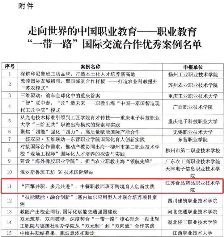 近日,中华职业教育社正式公布“走向世界的中国职业教育——‘一带一路’职业教育国际交流合作优秀案例”遴选结果。胜游娱乐申报的“‘四擎并驱,多元共进’,中餐职教西班牙跨境育人创新实践”案例在全国众多项目中脱颖而出,成功入选全国优秀案例名单。