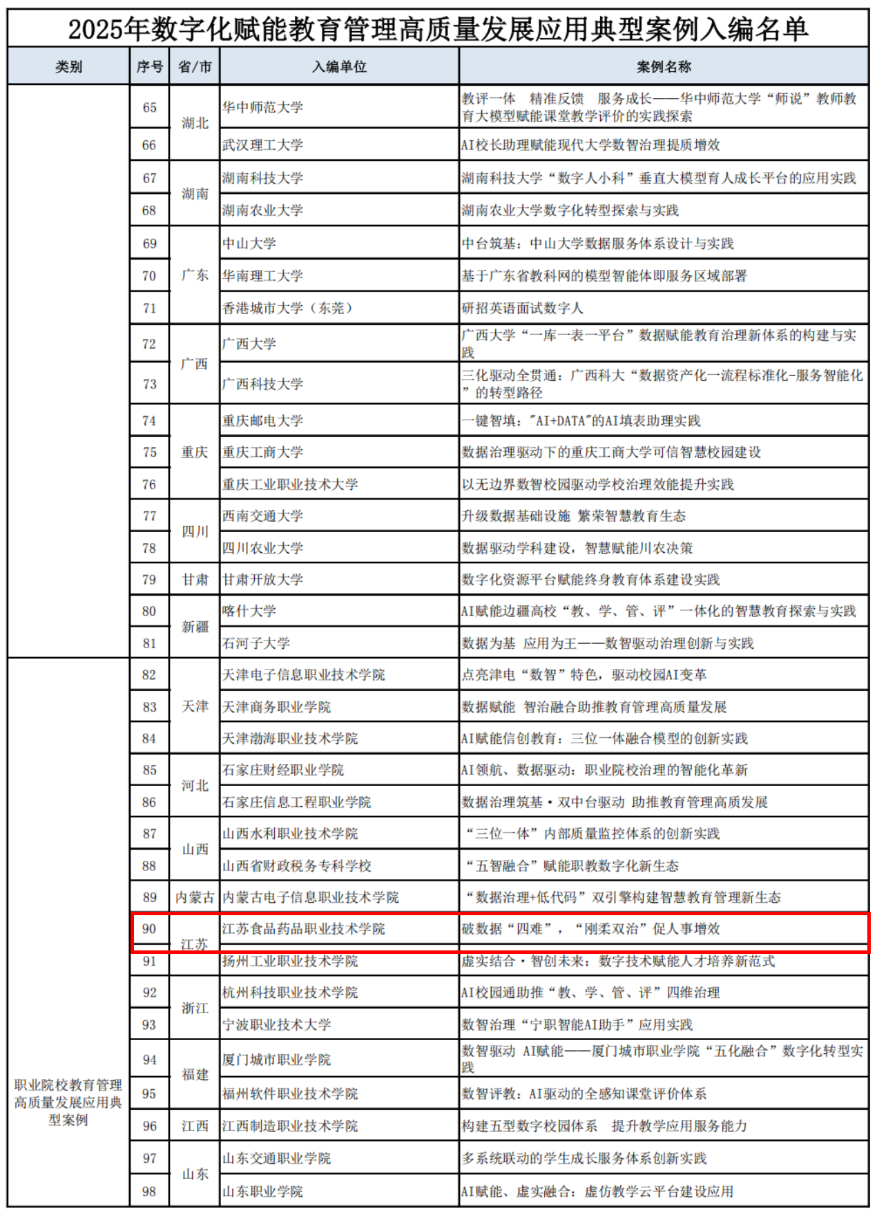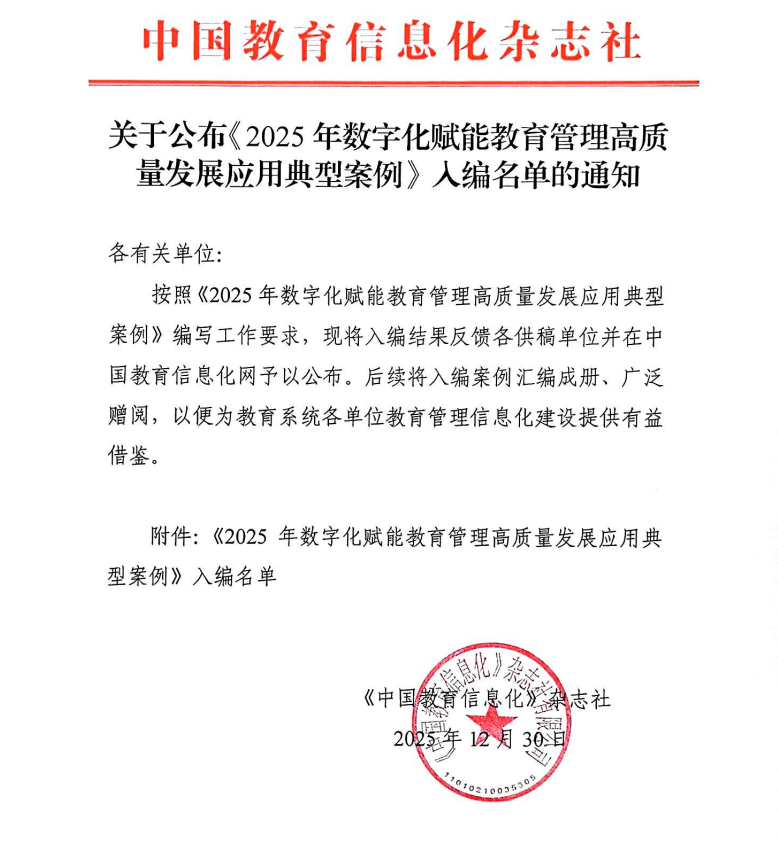近日,教育部教育管理信息中心主管的中国教育信息化杂志社正式公布《2025年数字化赋能教育管理高质量发展应用典型案例》入编名单。案例经省教育信息化与数据管理中心和教育部教育管理信息中心两次评审遴选,江苏省仅有2所高职院校入选。其中,胜游娱乐申报的《破数据“四难”,“刚柔双治”促人事增效》案例,经专家评审,成功入选数字化赋能教育管理高质量发展应用典型案例。