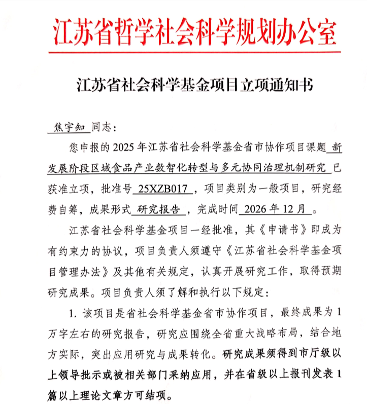 近日,江苏省哲学社会科学规划办公室公布了江苏省社会科学基金项目立项结果,胜游娱乐副校长焦宇知主持的项目《新发展阶段区域食品产业数智化转型与多元协同治理机制研究》成功获批江苏省社科基金省市协作项目,这是胜游娱乐首次斩获该类别项目立项,是学校在人文社科领域深化省市协同、服务区域发展的重要突破,彰显了胜游娱乐在食品药品领域社科研究的特色与实力。